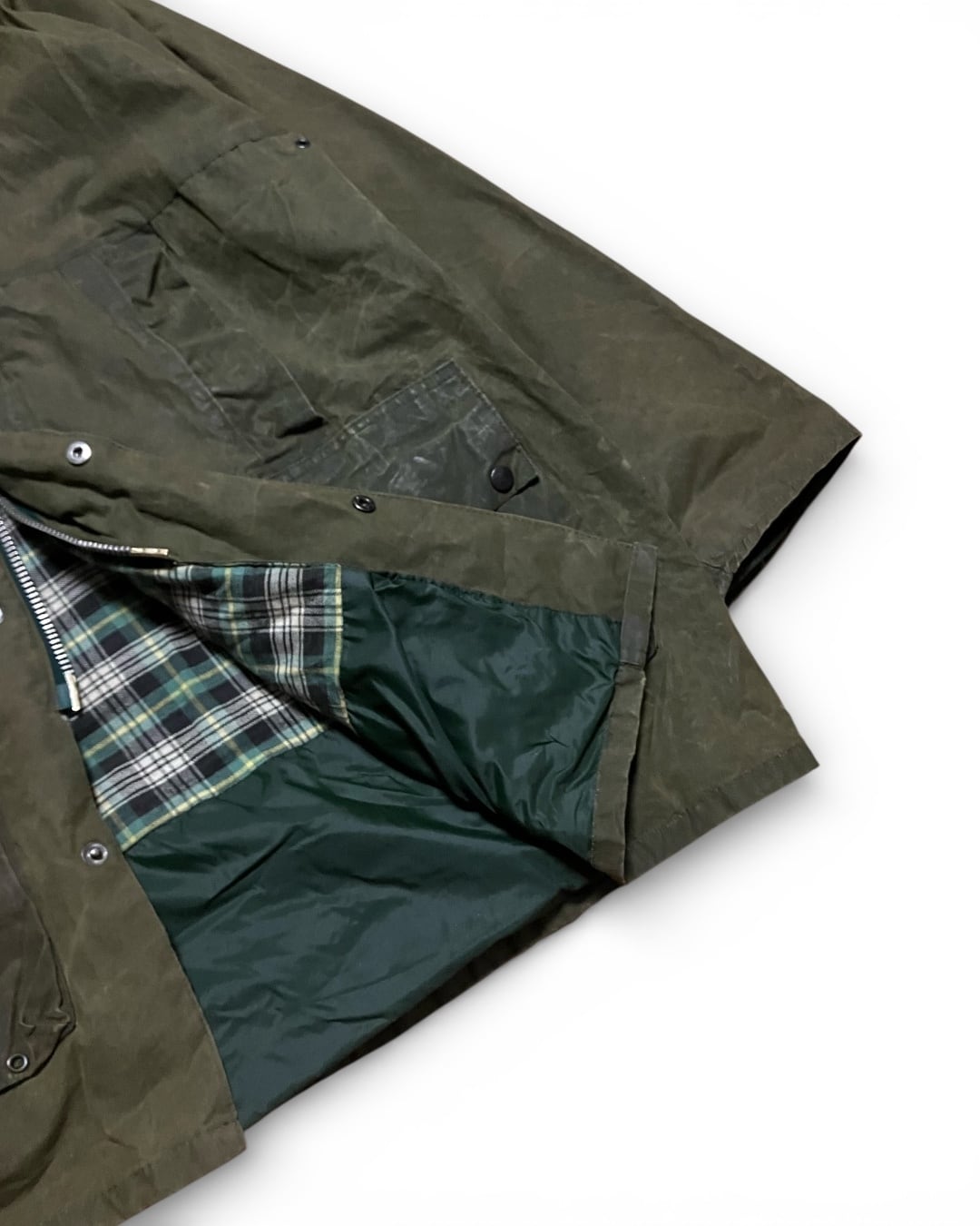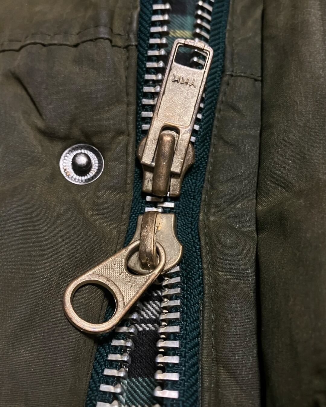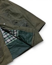 内側はクラシックなチェック。太畝コーデュロイの襟、金属スナップ、YKKジップ。ハンティング・フィールドウェアの流れを汲む、超トラディショナルな作り。