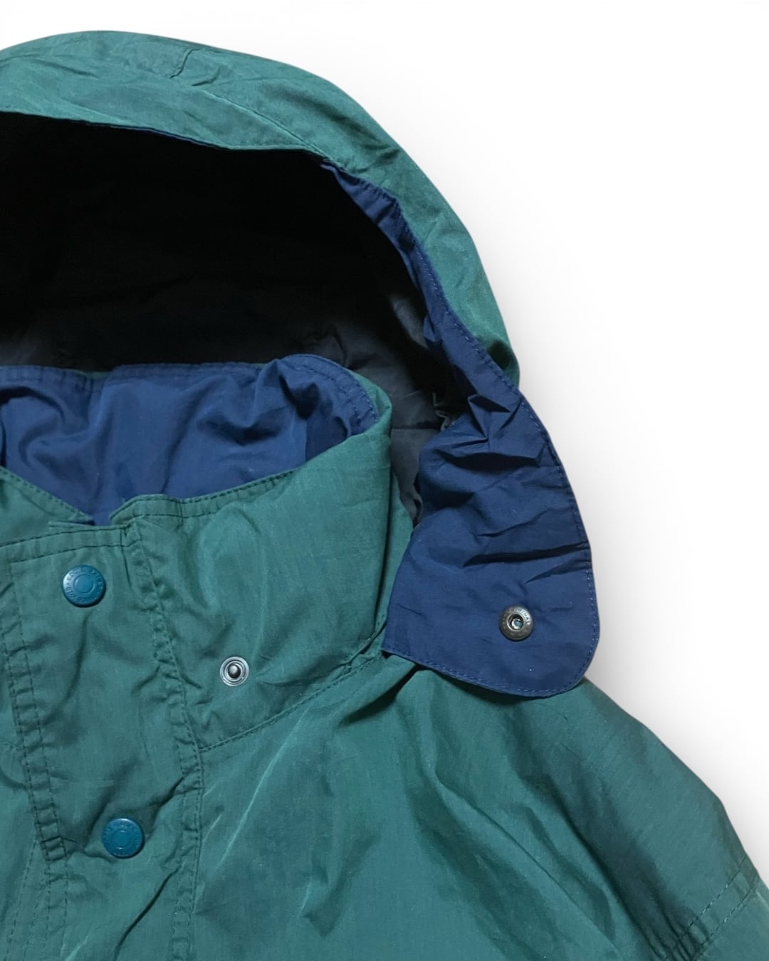 首元のスナップボタンに止めればフードの形を綺麗に保てる。